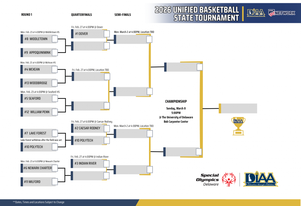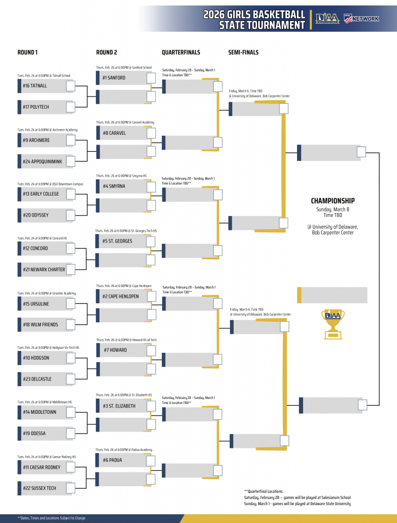 DOVER, DE – February 20, 2026 –  The Delaware Interscholastic Athletic Association (DIAA) is excited to announce the official bracket for the 2026 DIAA Boys Basketball State Tournament. The tournament will feature the top 24 teams in the state, competing for the championship title.