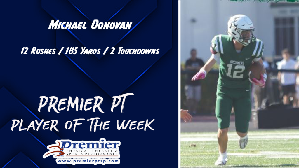 Please Subscribe to our Streaming Platform The Premier PT Player of the Week is Archmere’s Michael Donovan. Michael rushed 12 times for 185 Yards and 2 Touchdowns in a win
