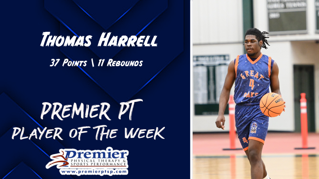 The Premier PT Player of the Week is Great Oaks Thomas Harrell. Harrell scored 37 Points with 11 Rebounds in a win over FSMA.